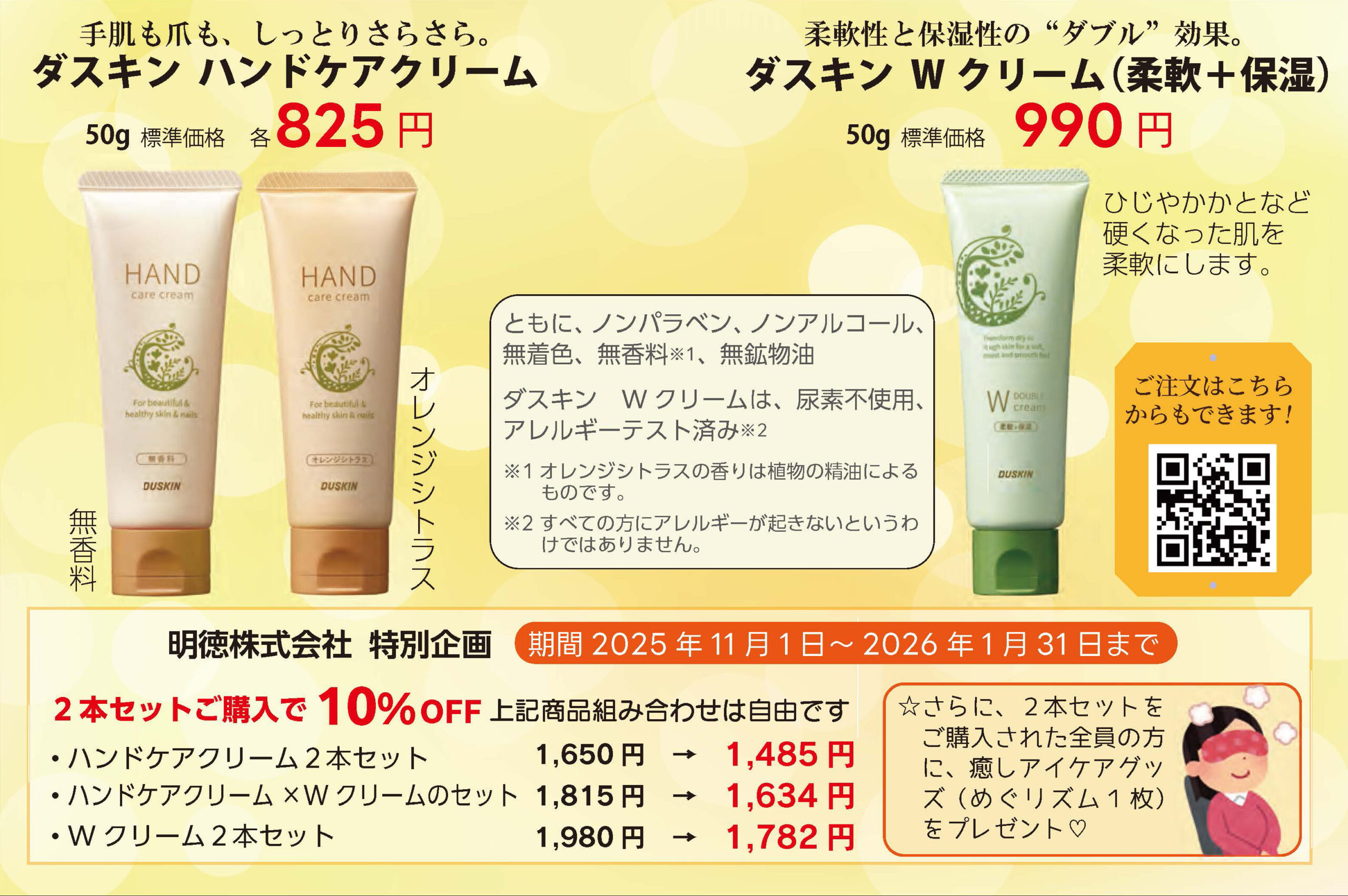 2025年11月1日~2026年1月31日 ダスキン ハンドケアクリーム2本セット(組み合わせ自由)ご購入で10%OFF 2025 10/27 キャンペーン ご注文はこちら キャンペーン 記事をシェアする URLをコピーしました!