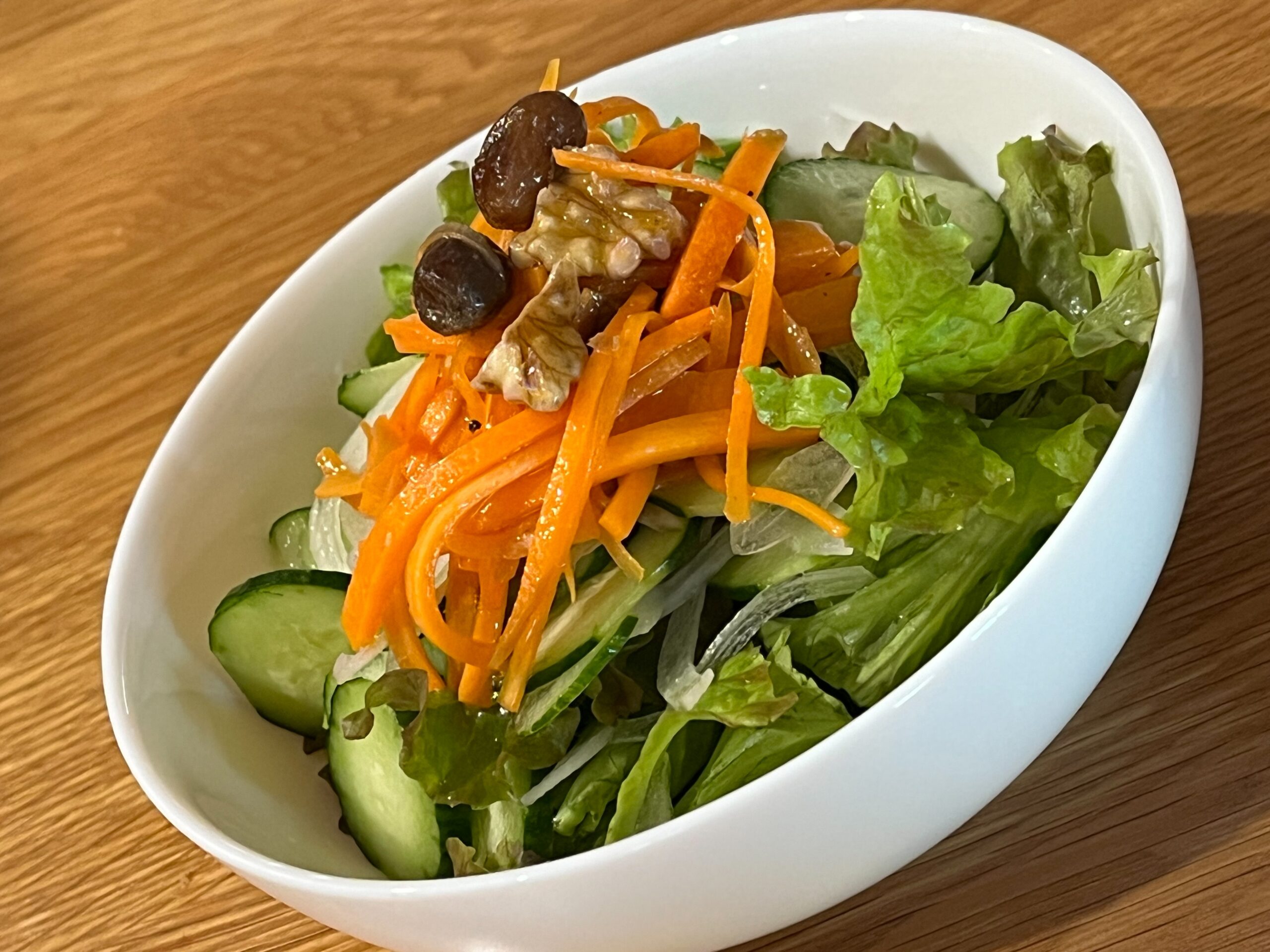 材料:にんじん、カンタン酢、塩・こしょう、レーズン、クルミ、さらっと油