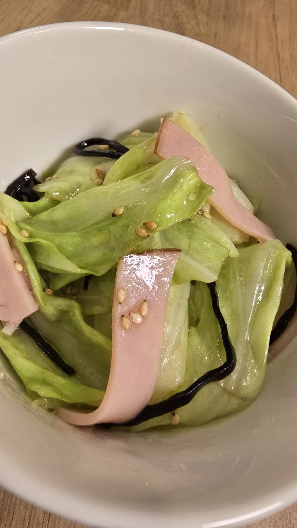 材料:キャベツ、塩昆布、ハム、カンタン酢、さらっと油