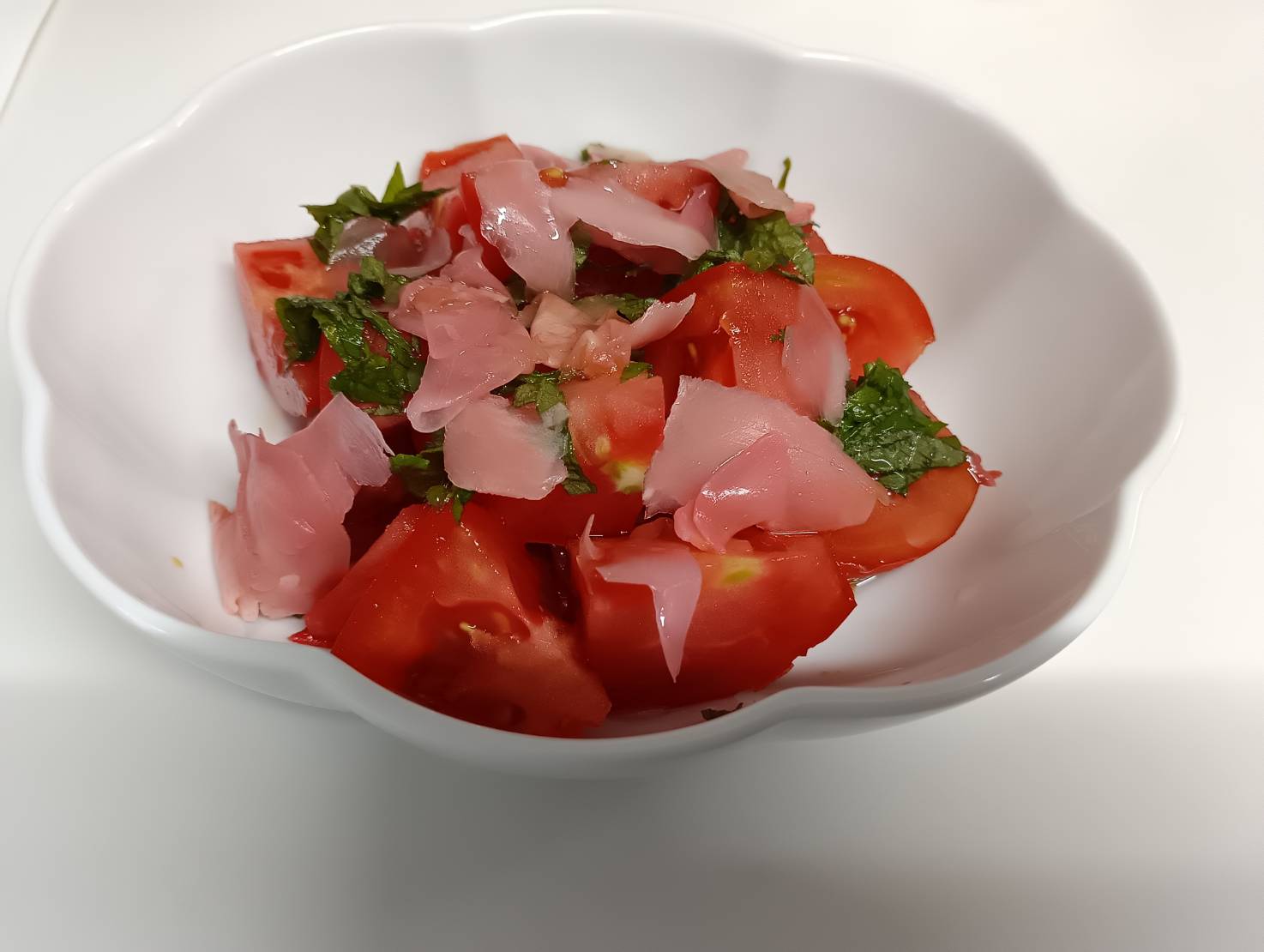 材料:トマト、ガリ、大葉、ポン酢、塩、さらっと油