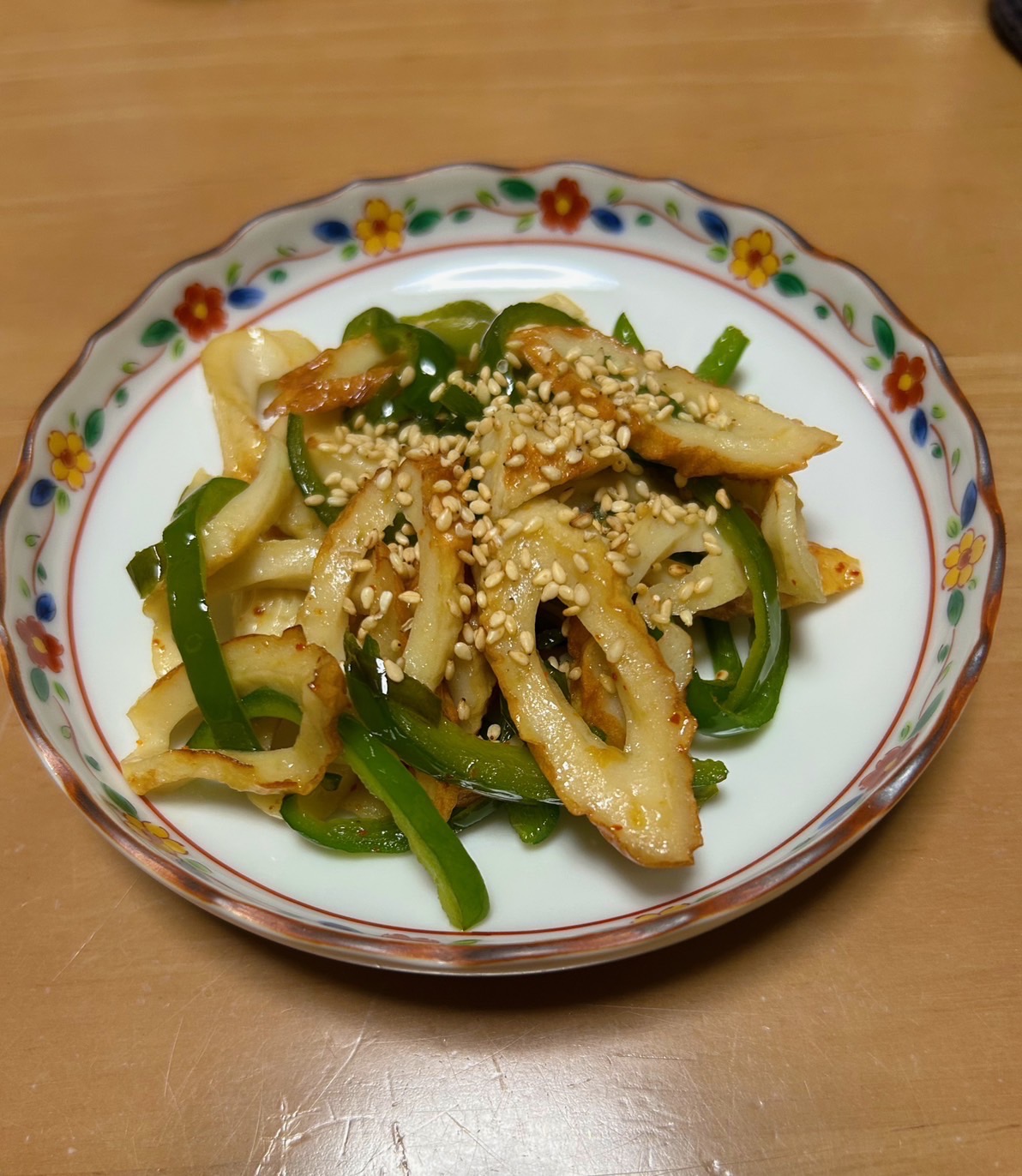 材料:ちくわ、ピーマン、めんつゆ、ゴマ、一味