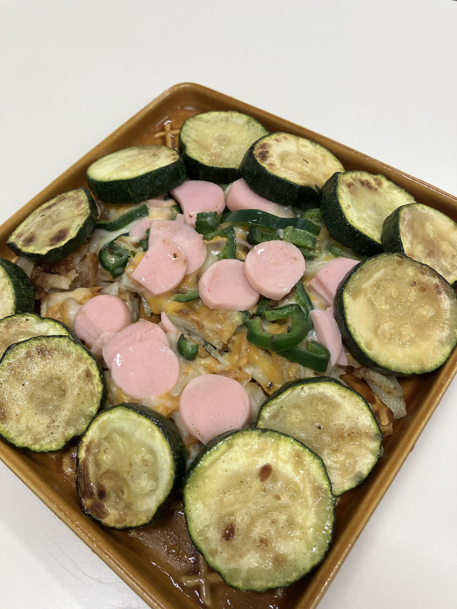 コメント:じゃがいもを千切りにし、ピザの生地に見立て、チーズや魚肉ソーセージ、ピーマンなどで作りました。さらっと油を使うことでさらっとしたお料理になりました♪